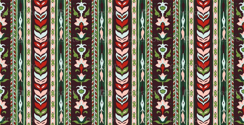 Геометрический дамасский орнамент. Икат границы. Этническая вышивка с листьями и монограммами. Племенная векторная текстура. Бесшовный народный узор в ацтекском стиле. Индийский, скандинавский, цыганский, мексиканский, африканский ковер