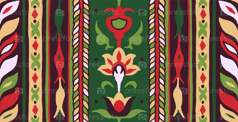 Геометрический дамасский орнамент. Икат границы. Этническая вышивка с листьями и монограммами. Племенная векторная текстура. Бесшовный народный узор в ацтекском стиле. Индийский, скандинавский, цыганский, мексиканский, африканский ковер