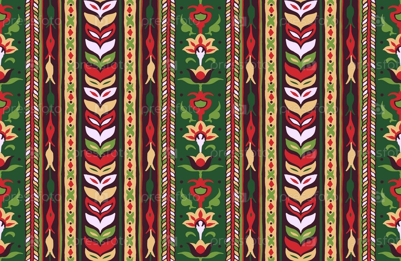 Геометрический дамасский орнамент. Икат границы. Этническая вышивка с листьями и монограммами. Племенная векторная текстура. Бесшовный народный узор в ацтекском стиле. Индийский, скандинавский, цыганский, мексиканский, африканский ковер
