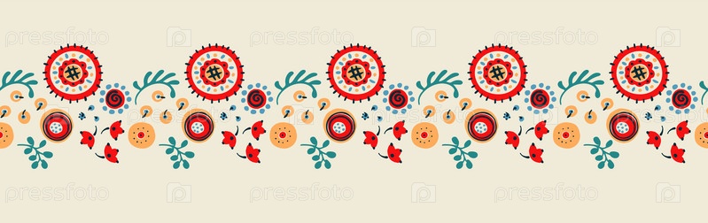 Набор этнических элементов. Бордюр представляет собой полосу с цветами, листьями, ветками, вензелями. Народная вышивка. Славянский, украинский, русский мотив. Хохлома, матрешка, дымковская игрушка. Мексиканский, индийский, цыганский ковер. Вязаное кружево