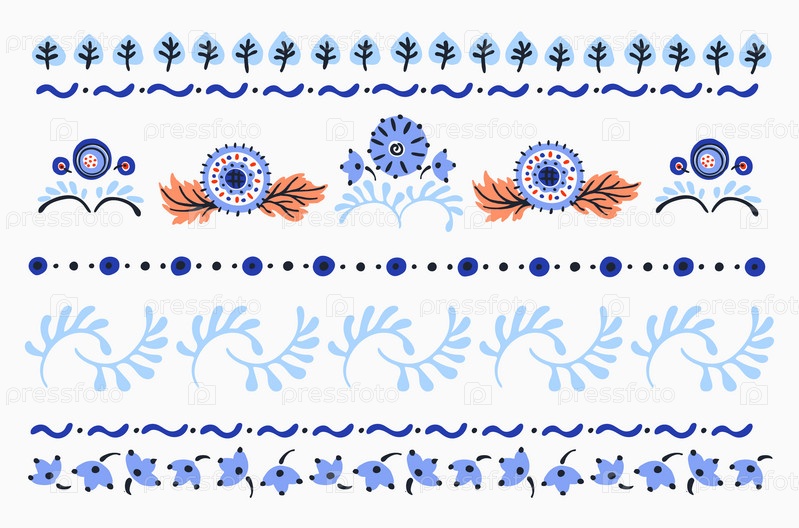 Набор этнических элементов. Бордюр представляет собой полосу с цветами, листьями, ветками, вензелями. Народная вышивка. Славянский, украинский, русский мотив. Хохлома, матрешка, дымковская игрушка. Мексиканский, индийский, цыганский ковер. Вязаное кружево