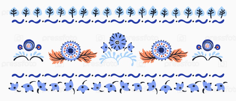 Набор этнических элементов. Бордюр представляет собой полосу с цветами, листьями, ветками, вензелями. Народная вышивка. Славянский, украинский, русский мотив. Хохлома, матрешка, дымковская игрушка. Мексиканский, индийский, цыганский ковер. Вязаное кружево