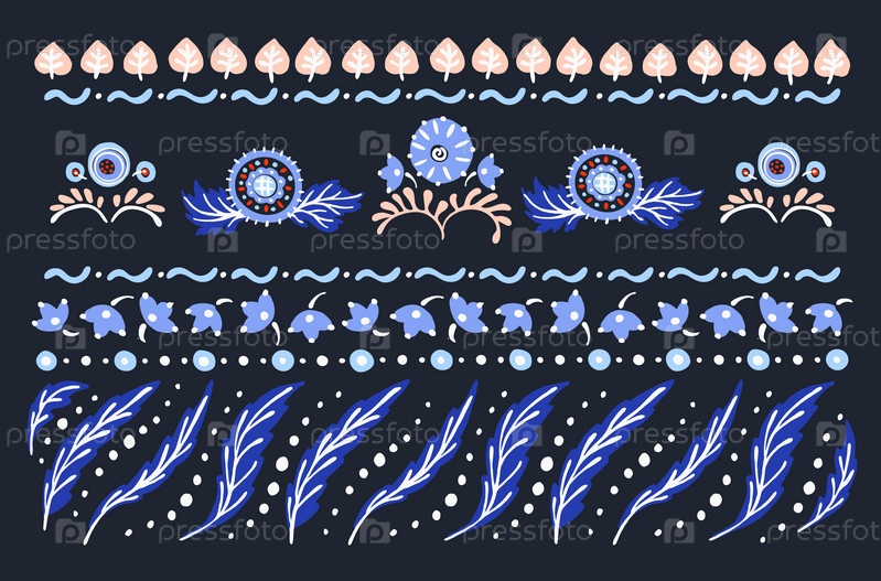 Набор этнических элементов. Бордюр представляет собой полосу с цветами, листьями, ветками, вензелями. Народная вышивка. Славянский, украинский, русский мотив. Хохлома, матрешка, дымковская игрушка. Мексиканский, индийский, цыганский ковер. Вязаное кружево