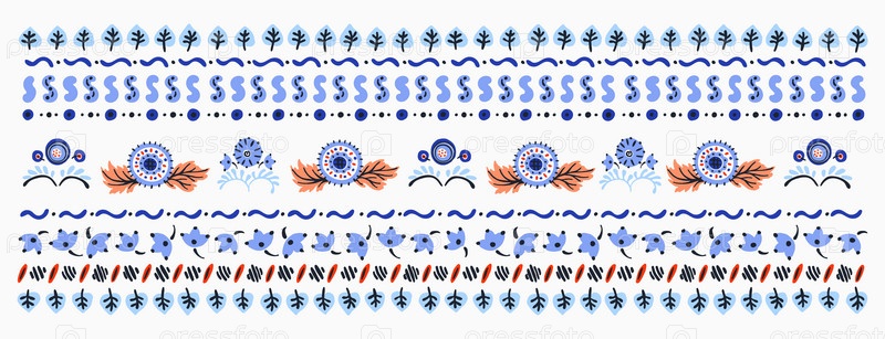 Набор этнических элементов. Бордюр представляет собой полосу с цветами, листьями, ветками, вензелями. Народная вышивка. Славянский, украинский, русский мотив. Хохлома, матрешка, дымковская игрушка. Мексиканский, индийский, цыганский ковер. Вязаное кружево
