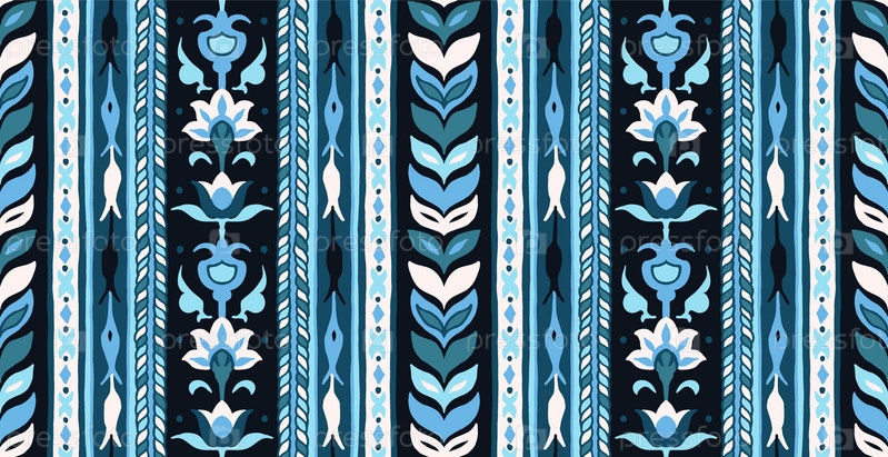 Геометрический дамасский орнамент. Икат границы. Этническая вышивка с листьями и монограммами. Племенная векторная текстура. Бесшовный народный узор в ацтекском стиле. Индийский, скандинавский, цыганский, мексиканский, африканский ковер