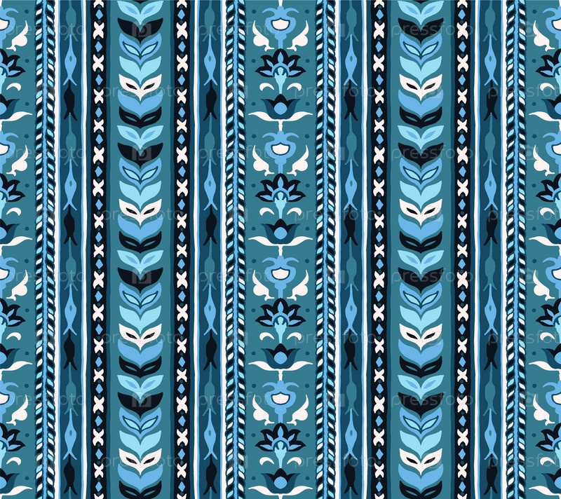 Геометрический дамасский орнамент. Икат границы. Этническая вышивка с листьями и монограммами. Племенная векторная текстура. Бесшовный народный узор в ацтекском стиле. Индийский, скандинавский, цыганский, мексиканский, африканский ковер