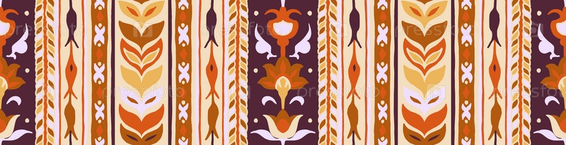 Геометрический дамасский орнамент. Икат границы. Этническая вышивка с листьями и монограммами. Племенная векторная текстура. Бесшовный народный узор в ацтекском стиле. Индийский, скандинавский, цыганский, мексиканский, африканский ковер