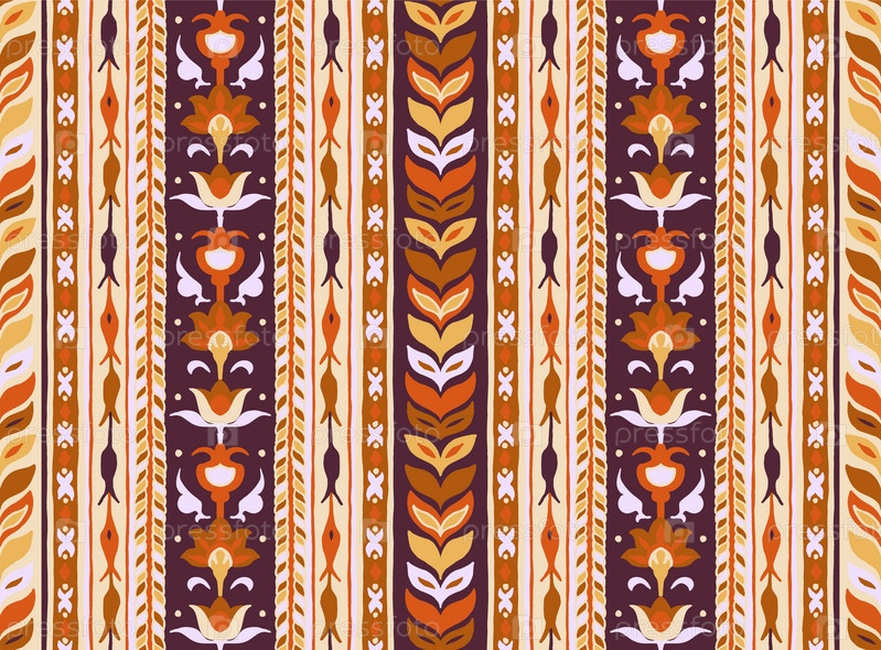 Геометрический дамасский орнамент. Икат границы. Этническая вышивка с листьями и монограммами. Племенная векторная текстура. Бесшовный народный узор в ацтекском стиле. Индийский, скандинавский, цыганский, мексиканский, африканский ковер