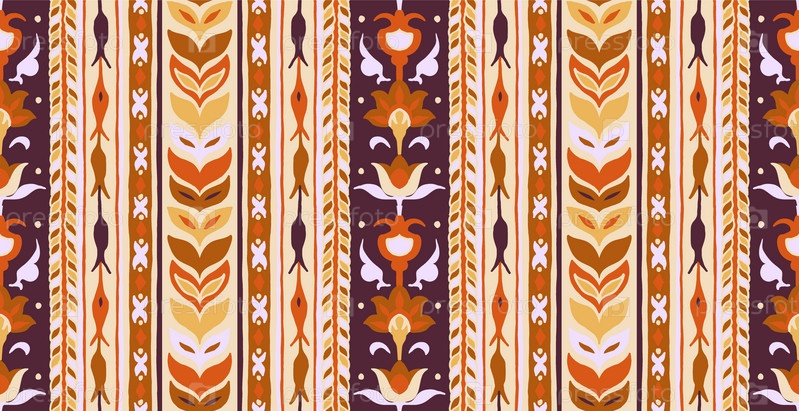 Геометрический дамасский орнамент. Икат границы. Этническая вышивка с листьями и монограммами. Племенная векторная текстура. Бесшовный народный узор в ацтекском стиле. Индийский, скандинавский, цыганский, мексиканский, африканский ковер