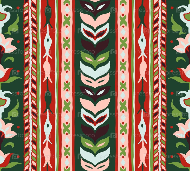 Геометрический дамасский орнамент. Икат границы. Этническая вышивка с листьями и монограммами. Племенная векторная текстура. Бесшовный народный узор в ацтекском стиле. Индийский, скандинавский, цыганский, мексиканский, африканский ковер