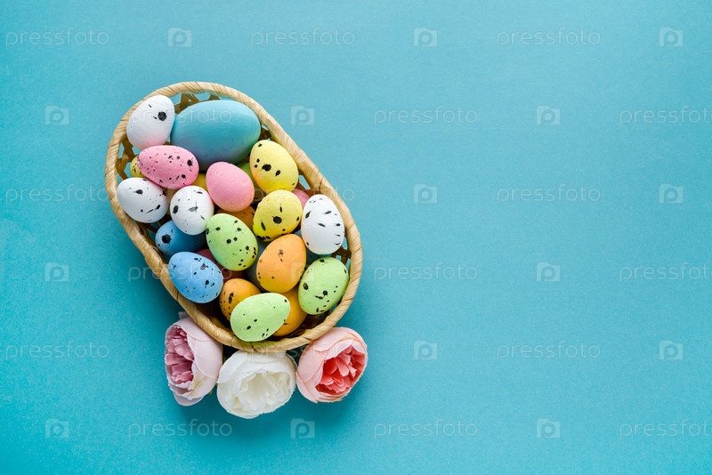 Корзина с пасхальными яйцами на синем фоне. Скопируйте пространство