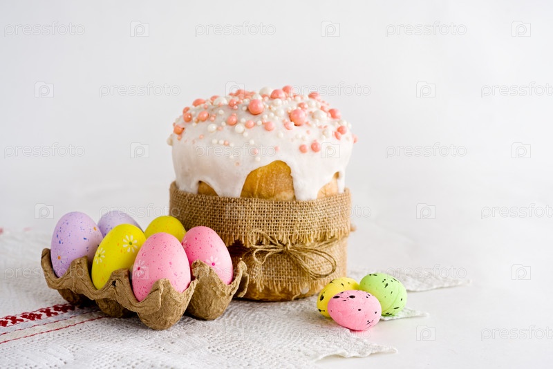 Пасхальный кулич и крашеные яйца на белом льняном фоне