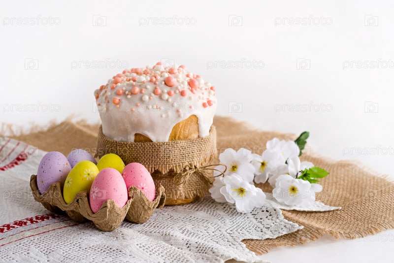 Пасхальное яйцо и пирог на светлом фоне стола. Счастливый пасхальный фон для весенних праздников