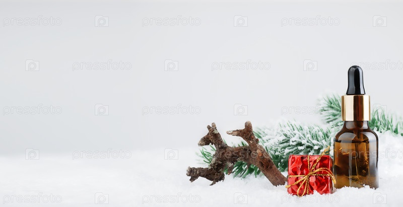 Макет стеклянной бутылки-капельницы. Бутылка с крышкой. Концепция косметологии и красоты. Косметика зимнего сезона. Подарки на Рождество или Новый год. Баннер. Пустая реклама с копией пространства