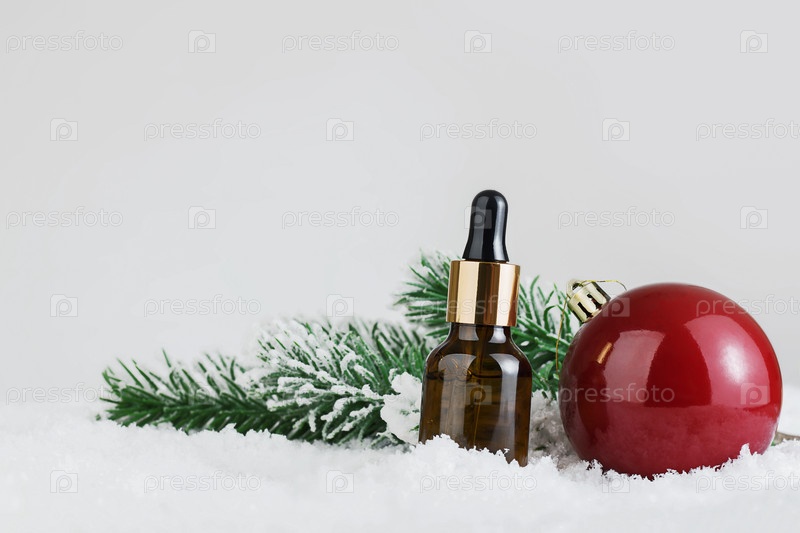 Макет стеклянной бутылки-капельницы. Бутылка с крышкой. Концепция косметологии и красоты. Косметика зимнего сезона. Подарки на Рождество или Новый год. Пустая реклама с копией пространства