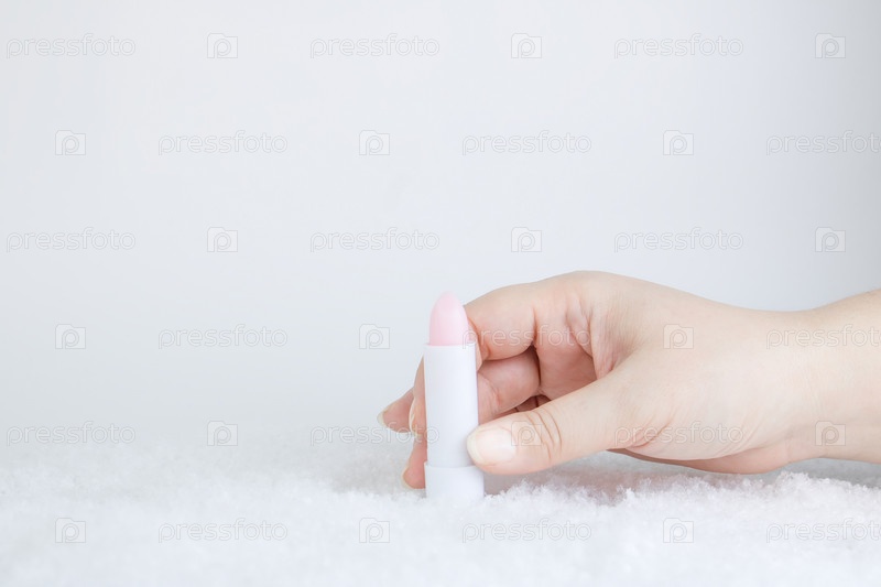 Белый тюбик розовой помады-бальзама для защиты и питания губ. Косметика зимнего сезона. Макет контейнера в женской руке в снегу. Идея рождественского подарка для женщин. Копировать пространство