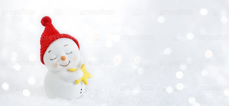 Рождественский фон. Счастливый снеговик, стоящий в зимнем рождественском пейзаже. Открытка с новым годом и рождеством. Забавный снеговик в шляпе на снежном фоне. Баннер. Копировать пространство