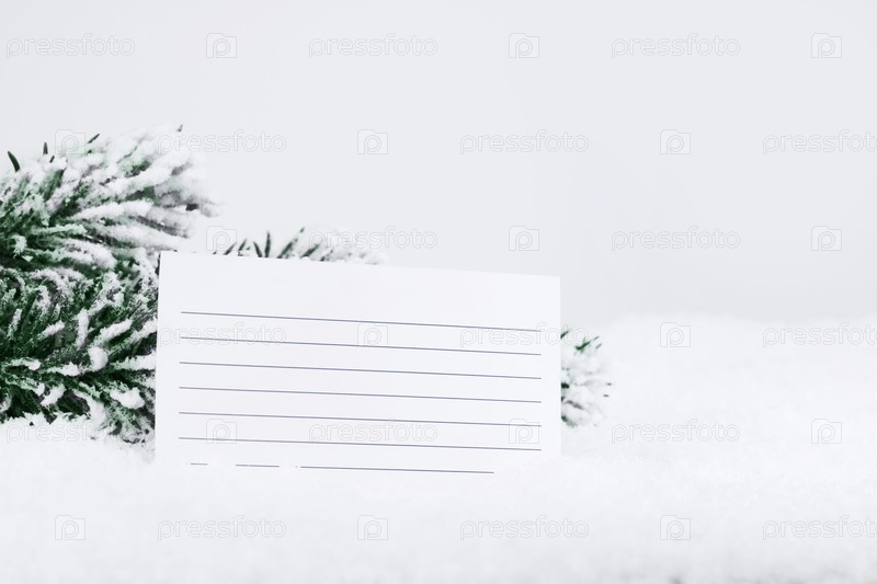 Белый лист в линейке, в снегу, возле ветки елки. Концепция Рождества и Нового года. Копировать пространство