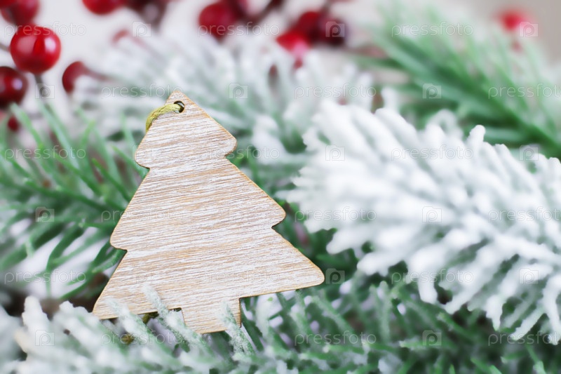 Деревянная подвеска на елку. Рождественские украшения для ели на фоне размытой ели со снегом. Открытка на Рождество или Новый год. Копировать пространство