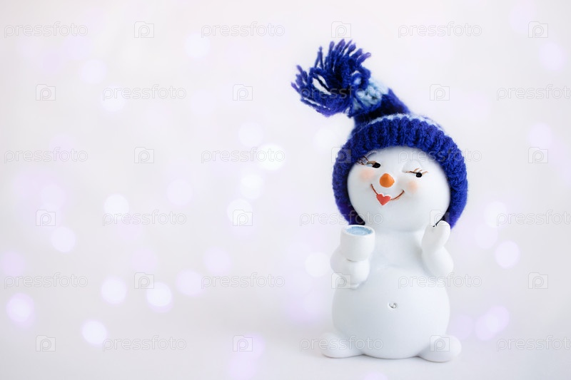 Рождественский фон. Счастливый снеговик, стоящий в зимнем рождественском пейзаже со стаканом. Открытка с новым годом и рождеством. Забавный снеговик в шляпе. Баннер. Копировать пространство