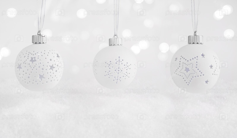 Рождественский фон. Белые рождественские украшения висят над снегом с огнями боке. Концепция Рождества и Нового года. Копировать пространство