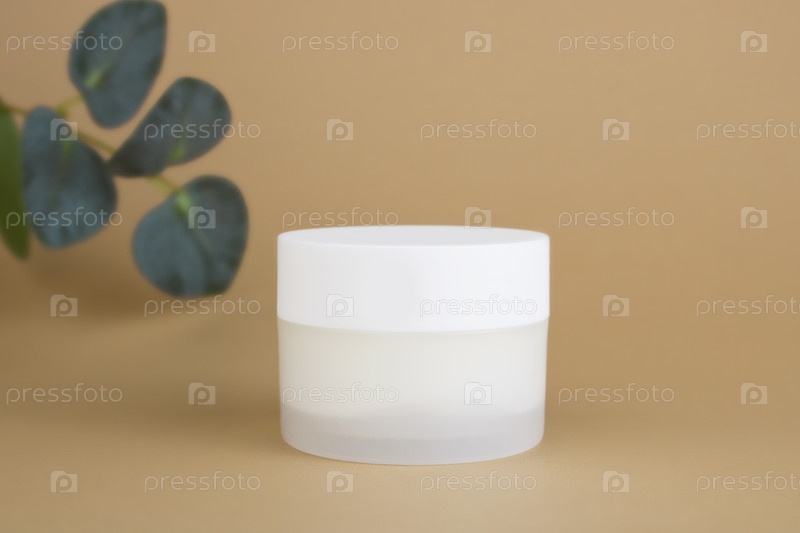 Банка увлажняющего крема на песчано-бежевом фоне. Натуральный косметический продукт, креативная концепция органической косметики. Макет белого пластикового контейнера с бальзамом для лица, тела. Копировать пространство