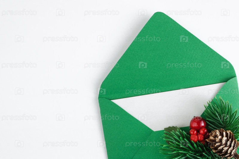 Зеленый конверт с белым листом и рождественской веткой на белом фоне. Рождественская почта. Концепция поздравления на Рождество или Новый год. Вид сверху. Плоская укладка. Копировать пространство