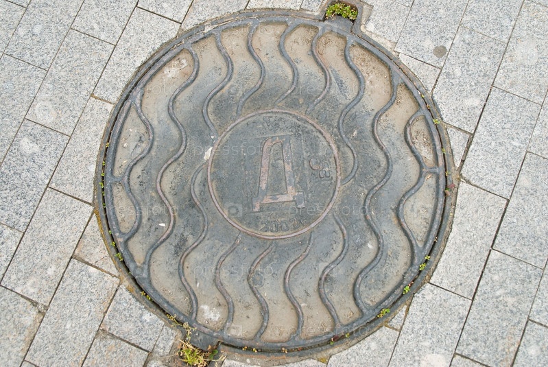 Старая крышка люка на асфальте в Калининграде, Россия
