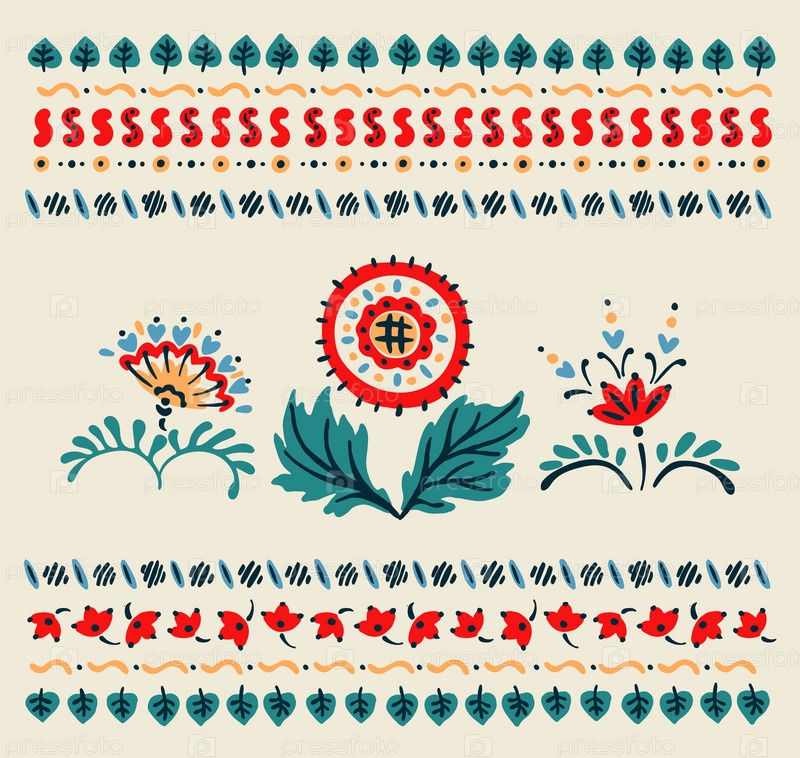 Набор этнических элементов. Бордюр представляет собой полосу с цветами, листьями, ветками, вензелями. Народная вышивка. Славянский, украинский, русский мотив. Хохлома, матрешка, дымковская игрушка. Мексиканский, индийский, цыганский ковер. Вязаное кружево