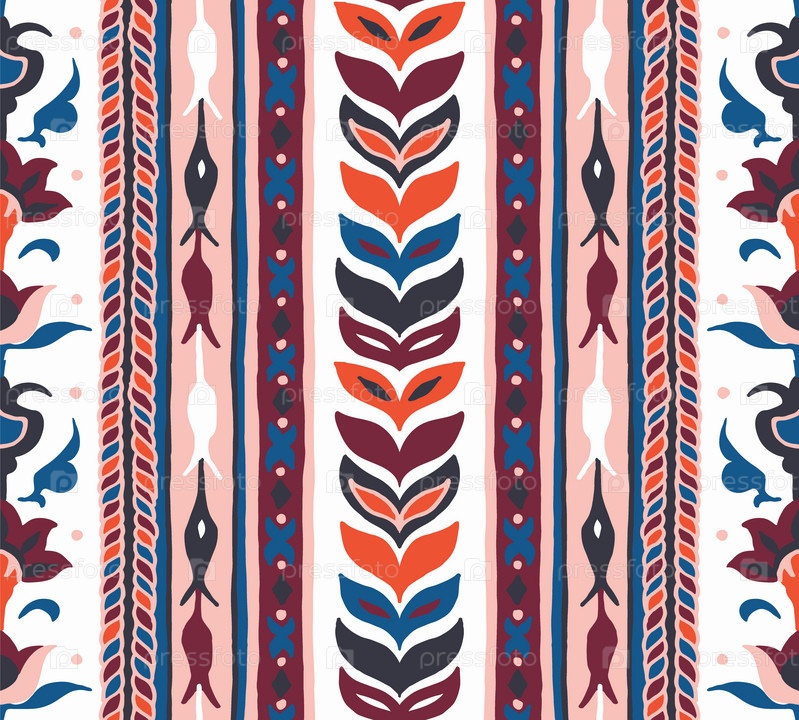 Геометрический дамасский орнамент. Икат границы. Этническая вышивка с листьями и монограммами. Племенная векторная текстура. Бесшовный народный узор в ацтекском стиле. Индийский, скандинавский, цыганский, мексиканский, африканский ковер