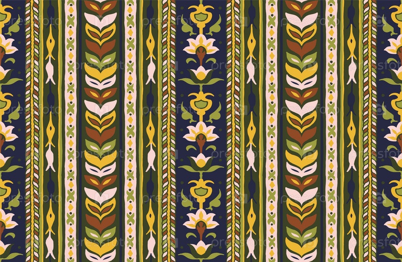 Геометрический дамасский орнамент. Икат границы. Этническая вышивка с листьями и монограммами. Племенная векторная текстура. Бесшовный народный узор в ацтекском стиле. Индийский, скандинавский, цыганский, мексиканский, африканский ковер