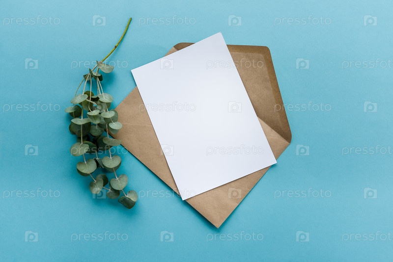 Конверт из крафт-бумаги с белой пустой карточкой и веточкой эвкалипта на синем фоне. Подготовка открытки