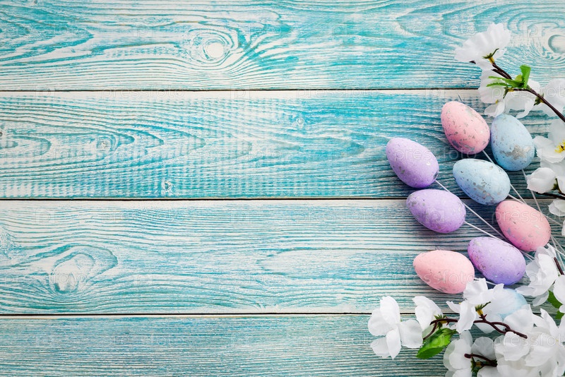 Пасхальные яйца на синем фоне сверху. Копировать пространство