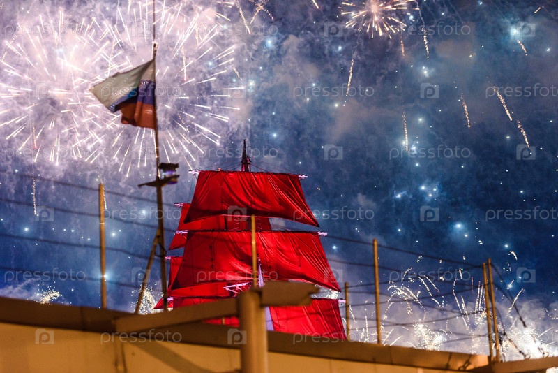 Россия, Санкт-Петербург, июнь 2021 г.: Ночной вид на Дворцовый мост. Алые паруса