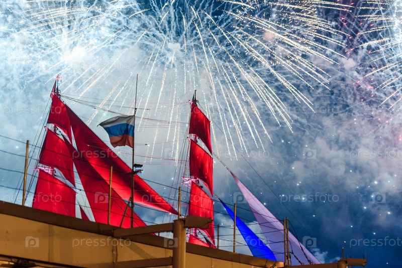 Ночной фейерверк на фоне неба. Алые паруса