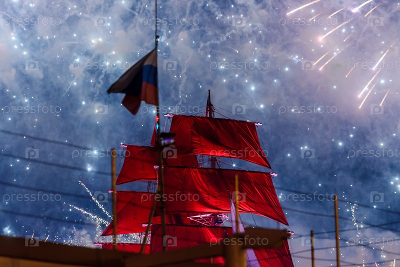 Ночной фейерверк на фоне неба. Алые паруса