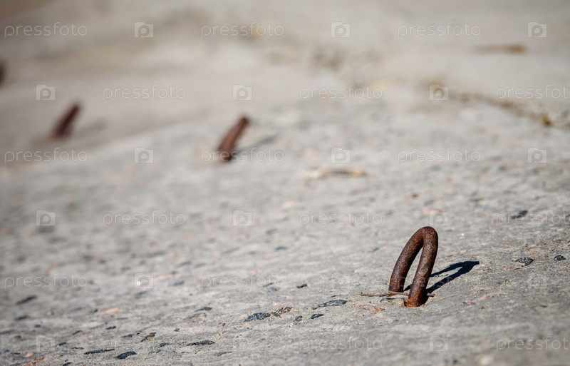 Бетонная плита с металлическими петлями вблизи морского канала или реки