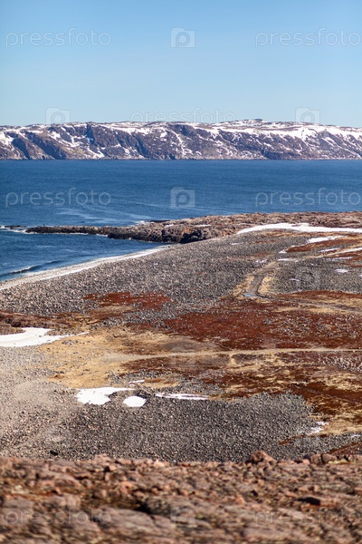 Море и тундра с ягелем и спокойной водой. Весна