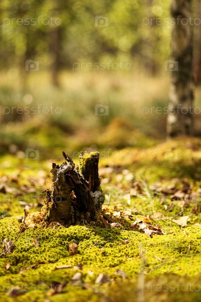 Пень на фоне яркого мха и березы (глубокое боке)