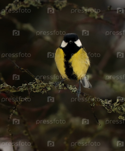 Большая синица на ветках в мхах