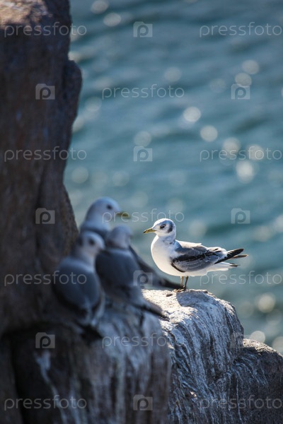 Моевки Чайки на фоне Баренцева моря в месте гнездования