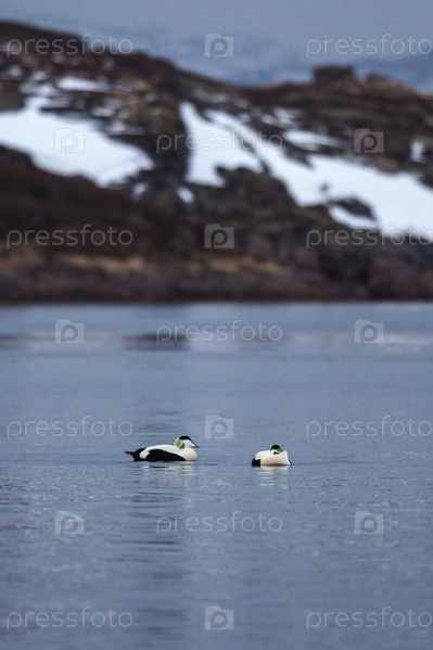 Обыкновенная гага в заливе Баренцева моря весной / На фоне сопок
