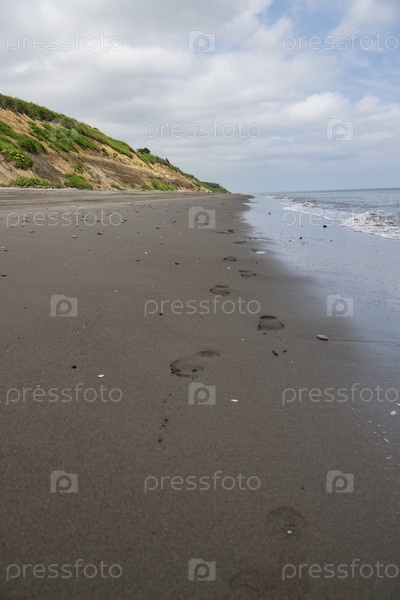 Пляж на побережье Северного моря со следами ног на песке