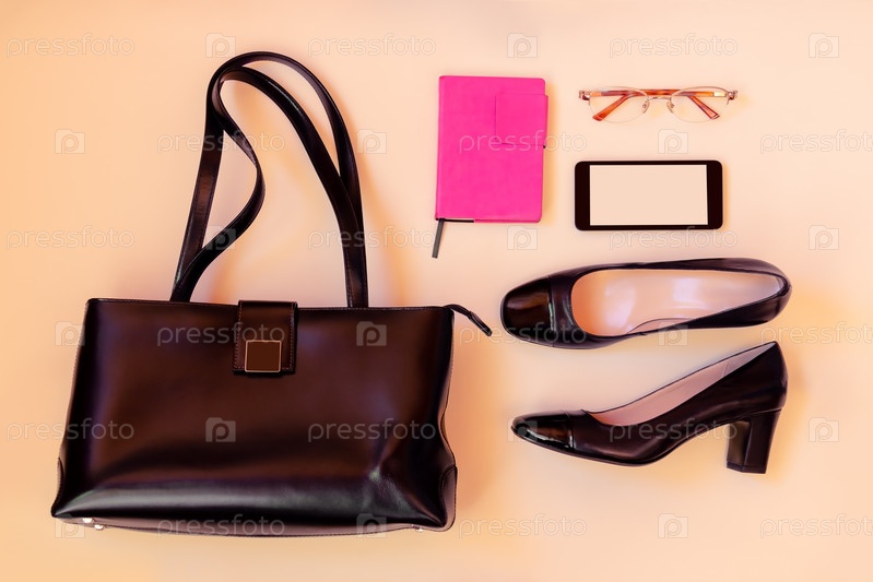 Черная кожаная сумка, черные туфли, смартфон и очки на пастельном фоне