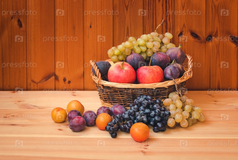 Плетеная корзина со свежими фруктами на деревянном фоне. Выборочный фокус