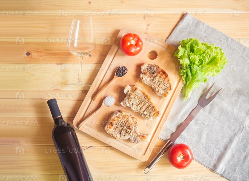 Стейки из свинины на гриле на разделочной доске, бутылка красного вина, пустой бокал, вилка и листья салата
