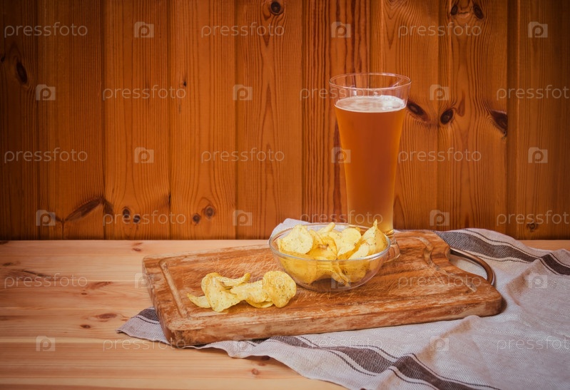 Стакан светлого пива с картофельными чипсами на деревянном столе