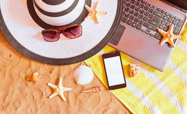 Ноутбук и смартфон с пляжными принадлежностями на песчаном пляже. Вид сверху