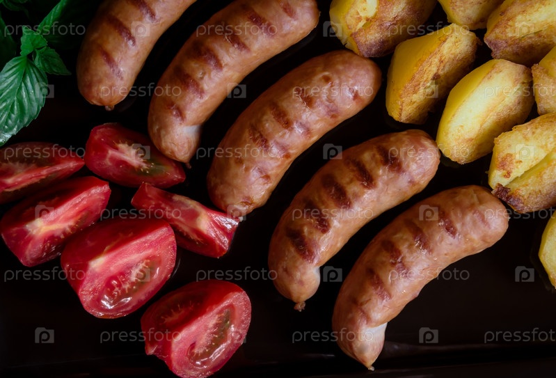 Жареные свиные колбаски, жареный картофель и свежие помидоры. Вид сверху. Крупным планом