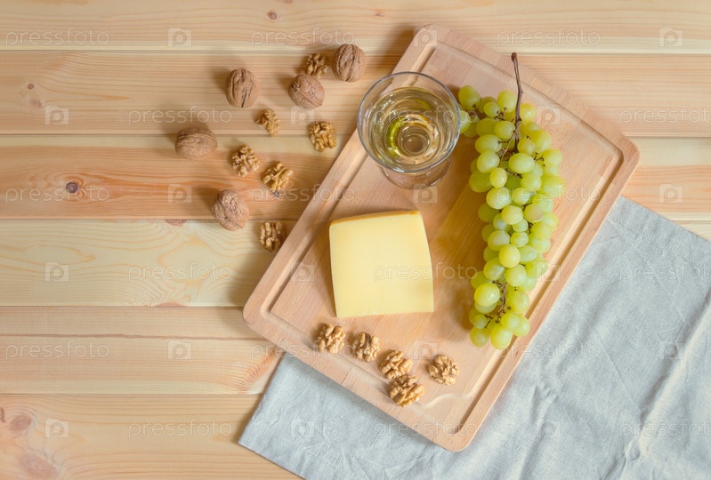 Бокал белого вина, сыр пармезан, грецкие орехи и виноградная ветвь на деревянном столе